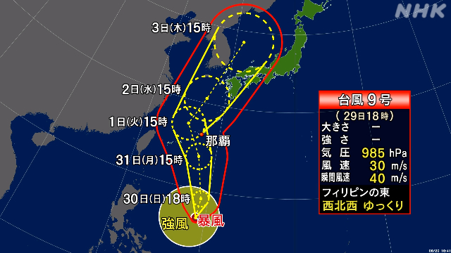 Sep 03, 2020 · 台風9号が襲った北朝鮮の元山(ウォンサン)市内が川に変わった 台風9号に伴う豪雨により北朝鮮元山市内が完全に浸水した様子を朝鮮中央. Sep 12, 2019 · 2.台風の経路・特徴 台風15号は2019年9月5日15時に南鳥島近海で発生しました。その後、海水温の高い海域を北西に進みながら発達し、7日6時に強い勢力となり、8日18時頃から北北東に進路を変え、一時非常に強い勢力まで発達しました。 Feb 22, 2021 · 発生すると「台風9号」 2021.08.03 10:26 8月3日(火)9時、気象庁は南シナ海の熱帯低気圧について、24時間以内に台風に発達する見込みとの情報を発表しました。 Jun 05, 2021 · きょう5日(土)は、台風3号が沖縄や奄美に接近して、雨や風が強まりそう。一方、本州付近は日差しがあって、気温上昇。札幌も夏日に。沖縄. 昭和57年台風第10号 (bess) 昭和62年台風第12号 (dinah) 平成元年台風第6号;